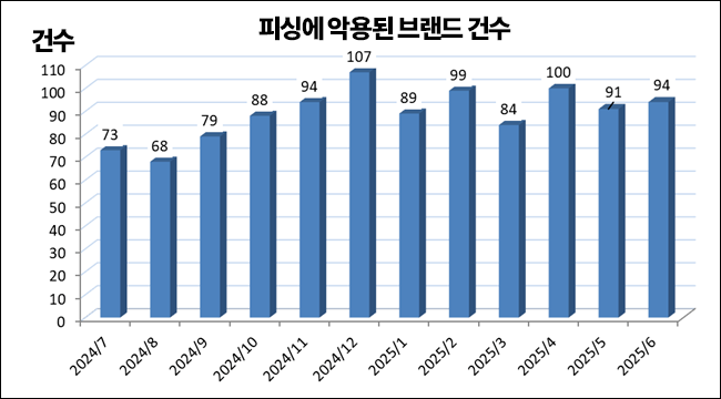 2025년 6월에 피싱에 악용된 브랜드 건수는, 전월보다 3건 증가한 94건이었다.