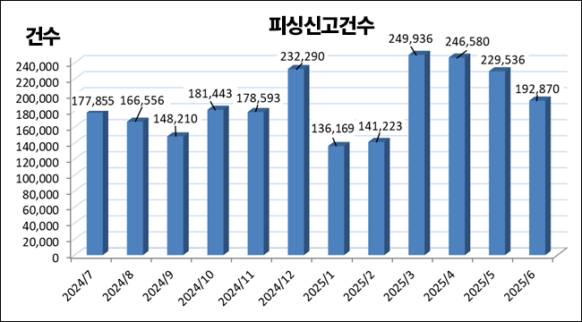 2025년 6월 피싱 보고건수는 192,870건이었고, 2025년 5월과 비교하면 36,666건 약 16.0% 감소하였다.
