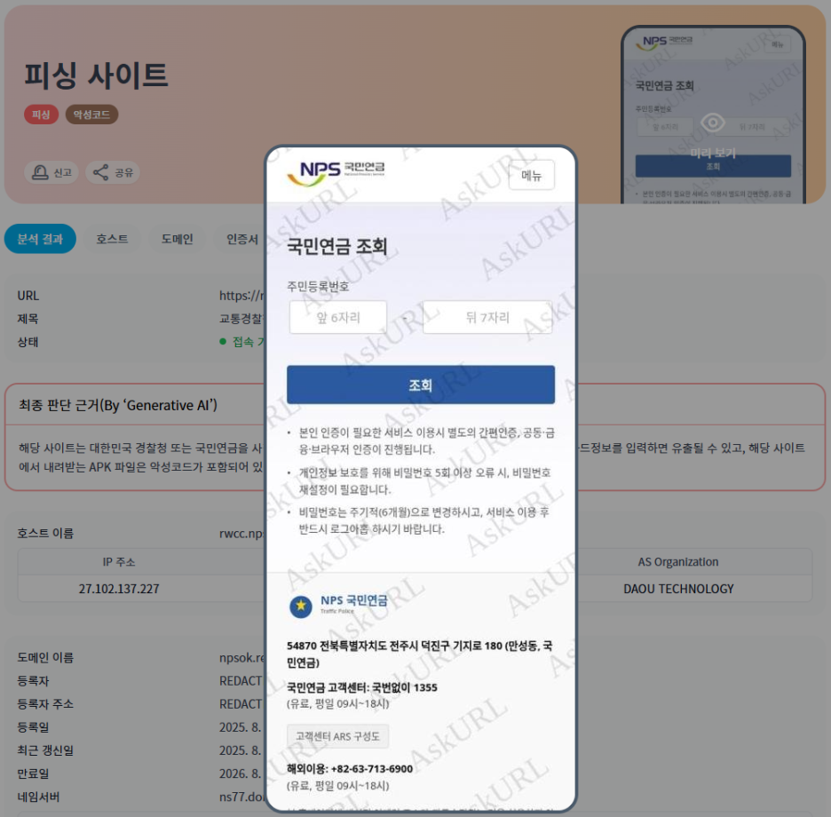 국민연금공단 사칭 피싱은 연금 조회, 보험료 납부 고지, 환급 안내, 연금 지급일 변경 등의 내용으로 문자 메시지를 이용자에게 발송해 시도하는 피싱 행위다. 이용자가 피싱 사이트에 접속하면 국민연금공단 공식 홈페이지와 유사한 디자인의 웹페이지가 보이고 이용자는 국민연금공단 공식 홈페이지로 오인해 피싱 사이트에 주민등록번호, 계좌번호, 휴대전화 번호 등 민감한 개인정보 입력을 입력하게 돼 피싱 피해를 입게 되는 방식이다.