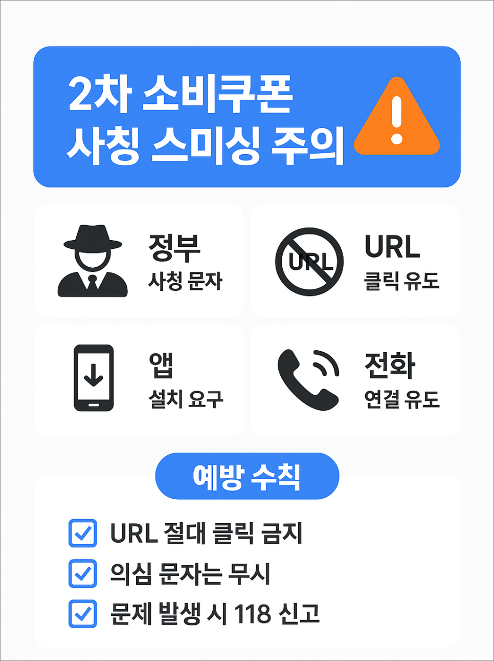 정부, 카드사, 은행 등 공식 기관은 소비쿠폰 신청·지급 관련 문자에 인터넷 주소(URL)를 포함하지 않습니다.