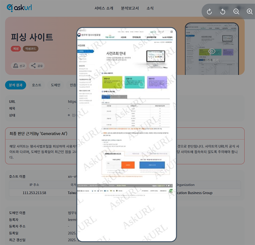 공공 분야 사칭 피싱 공격 중 대표적인 사례로 법무부 형사사법포털을 사칭하는 피싱이 있다. ‘사건 조회 안내’, ‘형사 사건 연루 통보’, ‘출석 요구’, ‘범죄 혐의 확인 필요’ 등이 포함된 메시지를 발송해 사용자의 불안을 가중시켜 가짜 사이트 접속을 유도하는 피싱 방법이다. 피싱 사이트는 사용자의 개인정보, 인증번호, 금융 계좌 정보, 휴대폰 소액 결제 정보 등 주요 데이터를 수집해 금융 사기에 활용한다.