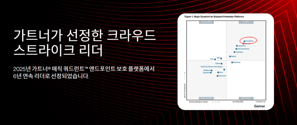 CrowdStrike는 2025년 Gartner® Magic Quadrant™ 엔드포인트 보호 플랫폼(EPP) 부문에서 6년 연속 리더(Leader)로 선정되었습니다. 특히, CrowdStrike는 3년 연속으로 ‘비전의 완성도(Completeness of Vision)’에서 가장 오른쪽, ‘실행 역량(Ability to Execute)’에서 가장 높은 위치에 동시에 자리하며, 기술 비전과 실행력 모두에서 업계를 선도하고 있음을 다시 한번 입증했습니다.