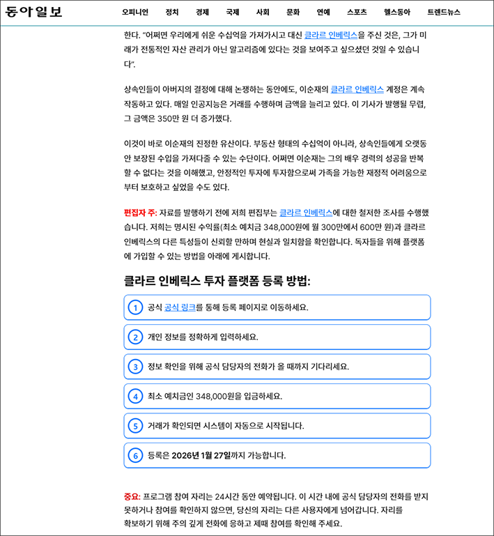 1. 동아일보 뉴스 플랫폼 사칭한 투자 피싱 사이트