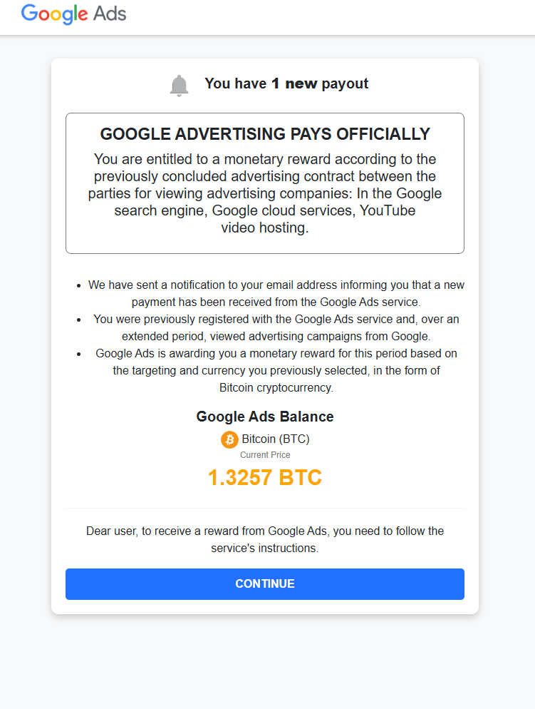 - Google Ads 보상·BTC 지급을 미끼로 계정 정보 탈취