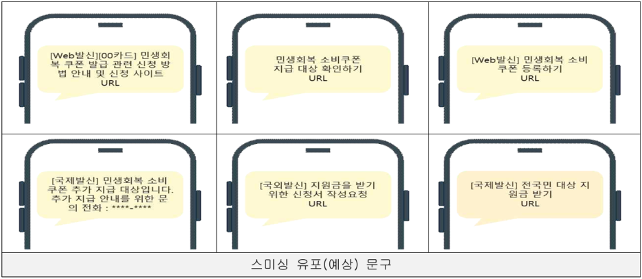 - (보이스피싱) 소비쿠폰 추가 지급 및 지급 방법 안내 등을 빙자한 유선 연락을 통한 원격제어 앱 설치 유도 및 피싱사이트 접속 유도 가능